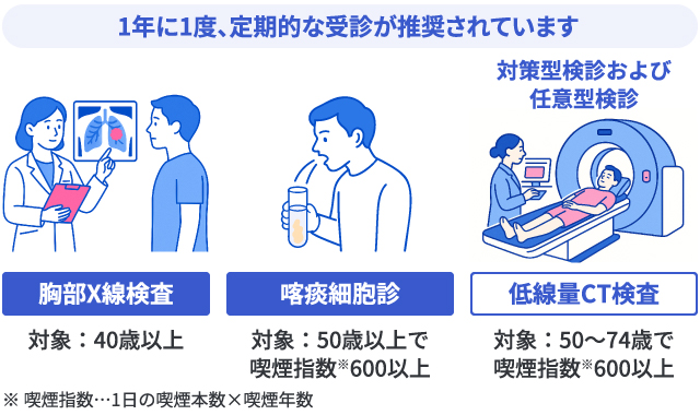 「肺がん検診」として、原則40歳以上の方を対象に1年に1度、定期的な受診が推奨されています。