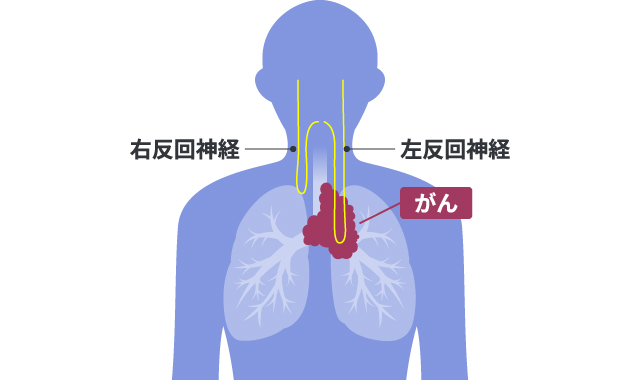 肺がんでの声枯れがある場合、がんの進行による反回神経麻痺も疑われます。