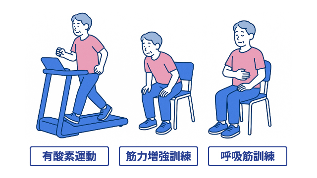具体的な治療内容としては、「有酸素運動」や「四肢や体幹の筋力増強訓練」のほか、呼吸機能を高めることを目的とした「呼吸筋訓練」などの呼吸リハビリテーションが行われます。