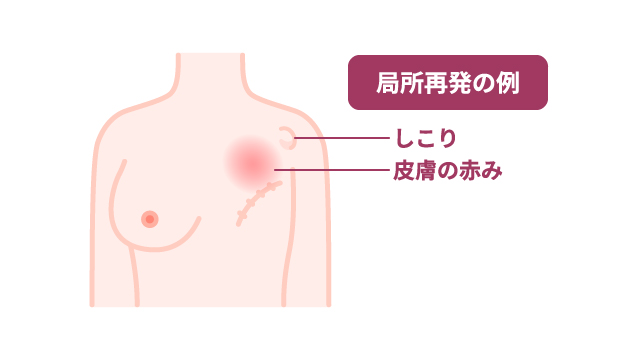 再発・転移の場所により異なります。手術した乳房や周辺の場合、皮膚の赤みやしこりがみられることがあります。