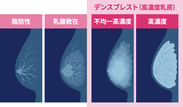 4段階ある乳房構成のうち、乳腺内に脂肪の混在がほとんどない「高濃度」と、乳腺内に脂肪が混在し不均一な濃度である「不均一高濃度」の上位2つの分類がデンスブレストとされています。