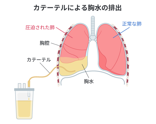 悪性胸水が確認された場合、胸腔ドレナージや胸膜癒着術などの治療が行われることがあります。胸腔ドレナージは、管を通して胸水を排出する方法で、胸膜癒着術は、薬剤を用いて胸水のたまる空間を閉じる治療法です。
