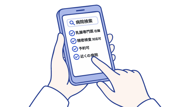 精密検査に対応可能な専門医、検査、治療体制かどうか確認し、通院しやすい場所を選ぶと良いでしょう。具体的には、乳腺専門医が勤務している医療機関です。乳腺外科、乳腺科が設けられていたり、「ブレストクリニック」といった名称がついていたりします。