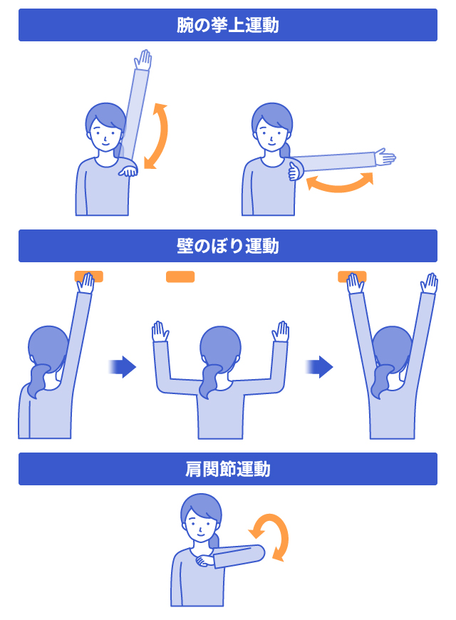 肩の周りの筋肉を動かす体操が推奨されます。強い痛みがある場合は無理なリハビリは避けてください。