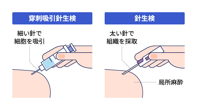 細胞診は多くの場合、局所麻酔の必要はなく、超音波で確認したり、手で触れたりしながら目的の場所に針を指します。検査時間は10分程度で、体の負担が少ない検査法ですが、細胞が上手く採取できなかった場合は診断が難しいこともあります。また、細胞診では病変全体の組織構造まではわからないため、必要に応じて針生検や外科的生検などのより詳しい検査が行われる可能性があります。