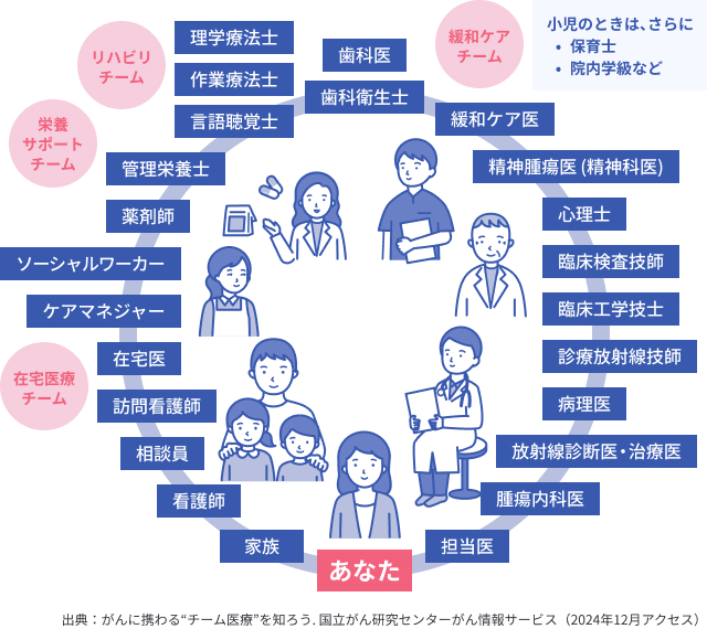 痛みや息苦しさなどの「身体的苦痛」、気分の落ち込みといった「精神的苦痛」、仕事や経済的な問題といった「社会的苦痛」について、主治医をはじめとする専門家がサポートします。